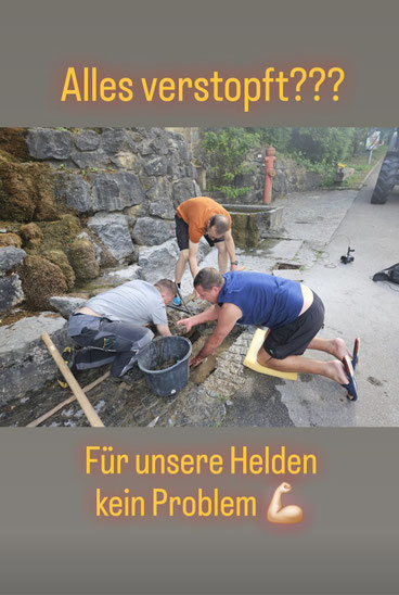 Nachdem der Abfluss verstopft war und das Wasser dadurch immer auf die Straße floss, war "Manpower" gefragt. Unsere "coolen Typen" konnten nach mühevoller Arbeit Abhilfe schaffen.